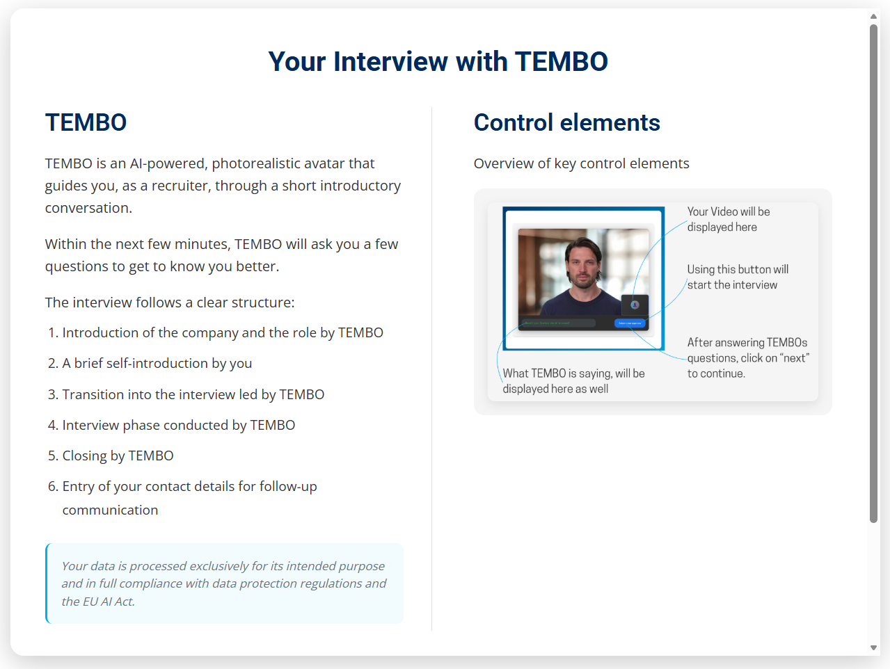 tlou.ai ist eine KI-basierte Plattform zur Unterstützung von Recruitingprozessen. Sie hilft Unternehmen, auch ohne eigene HR-Abteilung, Stellenanzeigen zu erstellen, Bewerbungen zu analysieren und strukturierte Entscheidungsgrundlagen zu gewinnen. Neben klassischen Bewerbungsunterlagen nutzt tlou.ai einen KI-Avatar-Videoagenten, der auf Basis individuell auf die jeweilige Stelle und das Unternehmen zugeschnittener Interviewfragen erste Screening-Gespräche führt. Die KI wertet Gespräch und Profil gemeinsam aus und liefert fundierte Einblicke in Fähigkeiten, Erfahrungen und kulturelle Passung der Bewerber und Bewerberinnen.